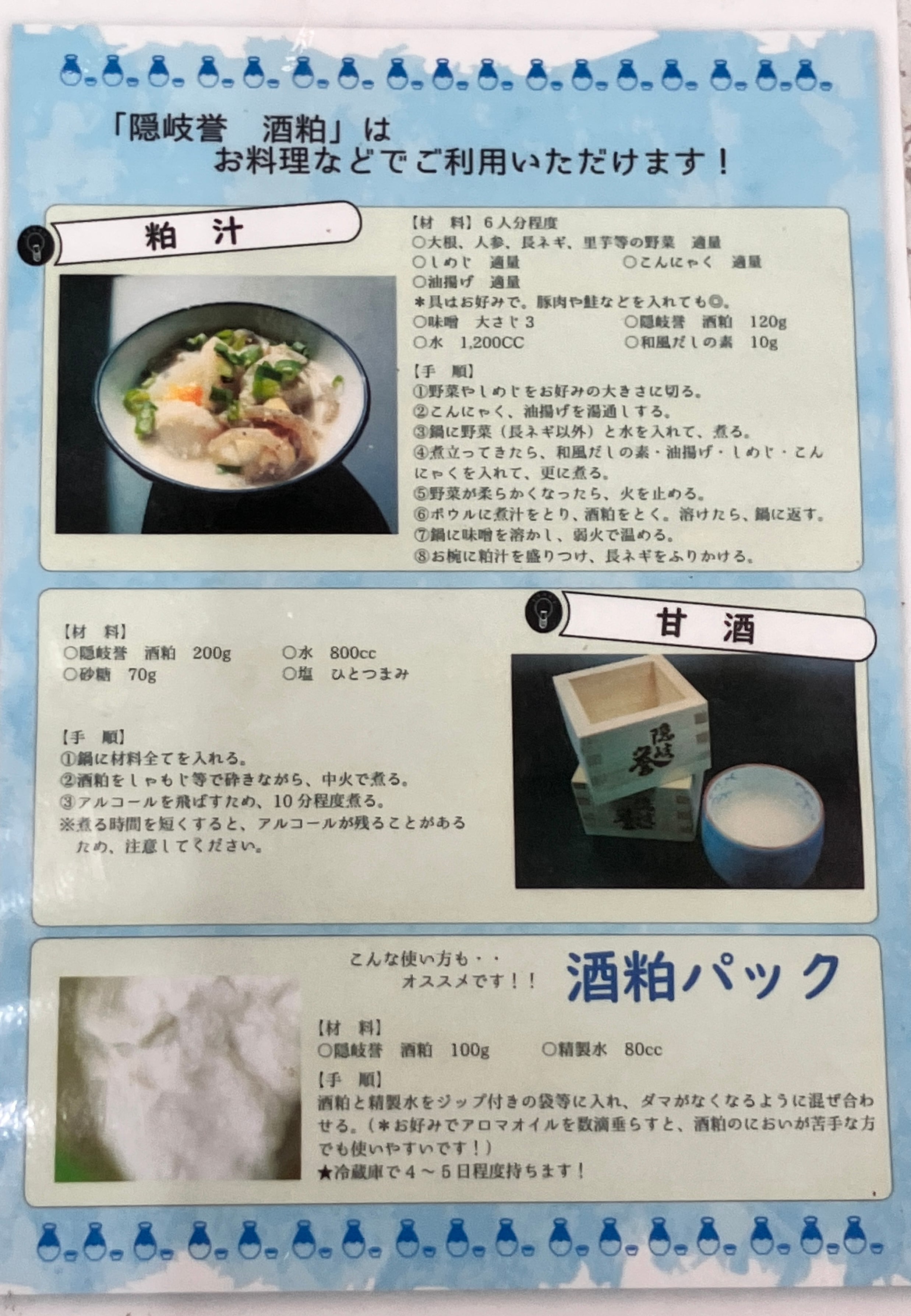 板粕は、特に料理の隠し味として使うと、独特の旨みが加わり、料理のクオリティを一段と引き上げてくれます。また、発酵食品として健康にも嬉しい効果が期待できます。ぜひ、日々の食卓に隠岐の恵みを取り入れてみてください!